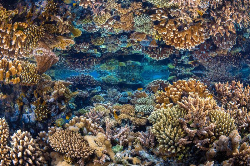 Esta impresionante imagen de corales reflejados durante la marea baja en la isla Mayotte del archipiélago de las islas Comoros quedó en tercer lugar en la categoría Conservación (Esperanza) del concurso Fotógrafo del Océano del Año de 2023. Es una muestra visual de un arrecife de coral en un estado prístino, resaltando su belleza y su importancia en la conservación marina.