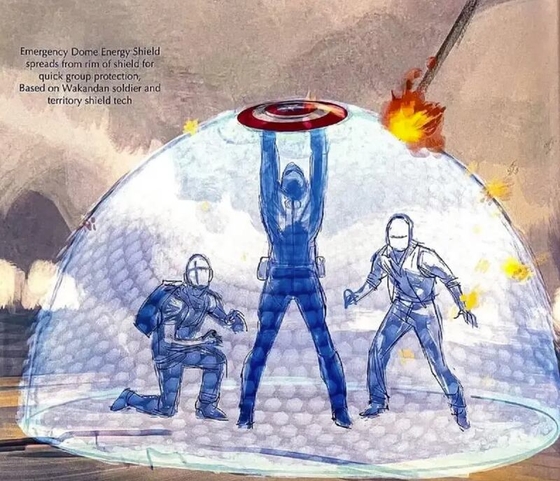 “Inmediatamente, pensé en las diversas tecnologías de escudo utilizadas por la tribu fronteriza de Wakanda. Sus escudos de capa azul. También el gran escudo de camuflaje alrededor del lugar. Era un buen punto de partida sobre cómo podría implementarse en este personaje”, explicó Burt.