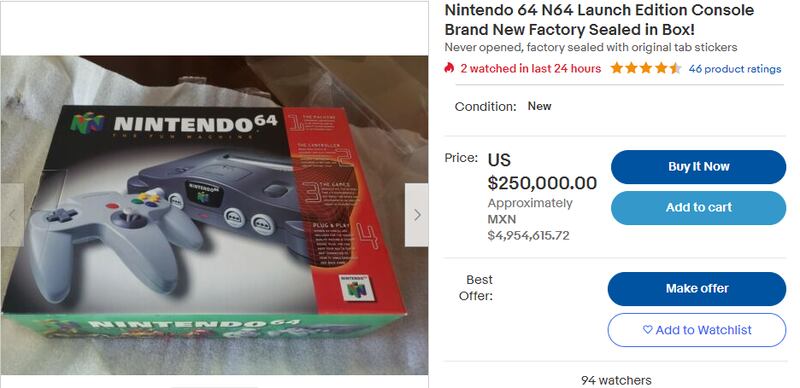 En esta temporada navideña muchos cuentan con un amplio margen de presupuesto para gastar en algún regalito costoso. Tal vez pensando en ese escenario alguien tuvo la idea de subir una Nintendo 64 nueva y sellada al sitio de eBay para pedir una cantidad astronómica de dinero por ella.