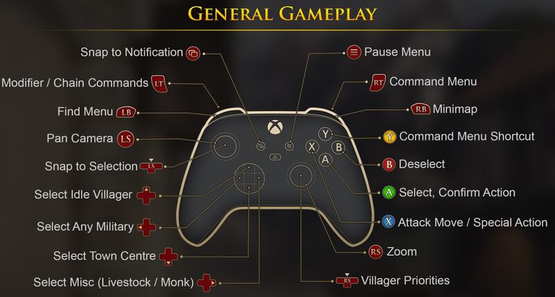 Ya que esto de jugar AoE con control es nuevo, nos detendremos en este punto. Nuestro botón principal será el A , con el que seleccionaremos unidades/estructuras y confirmaremos acciones, mientras que con el B cancelaremos y deseleccionaremos. El RT presionado será nuestro Menú de Comando, que permitirá acceder a cada menú de unidad/estructura, pudiendo seleccionarlo con el stick y A.