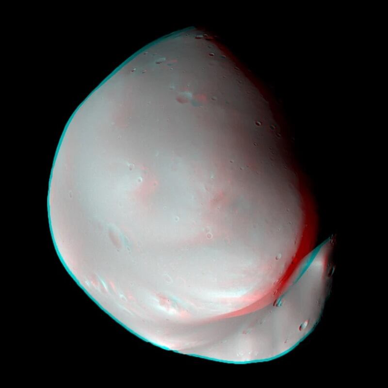 Deimos es un objeto pequeño y lleno de bultos y cráteres; sin embargo, son más pequeños que los de Fobos, con apenas 2.5 kilómetros de diámetros, y sin tantos surcos y crestas.
