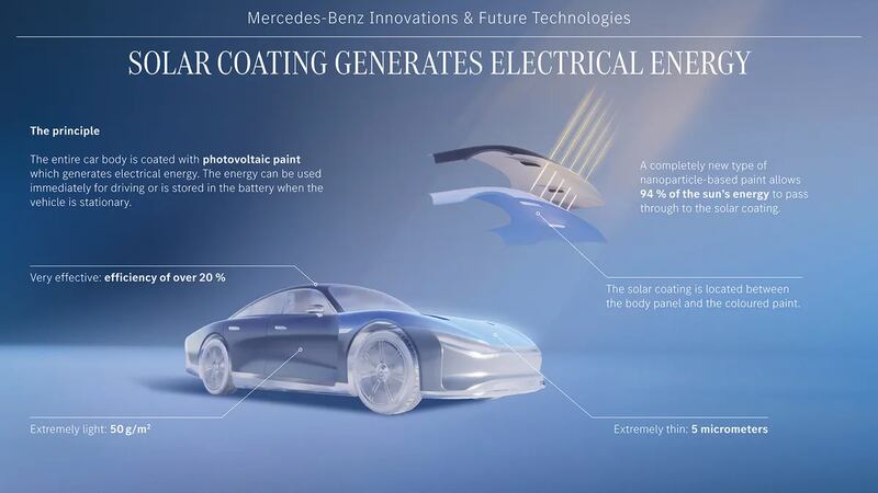 Además, esta solución no hará que tu auto luzca como un panel solar con ruedas. La pintura a base de nanopartículas deja pasar el 94% de la energía solar mientras mantiene el diseño elegante que esperarías de un Mercedes.
