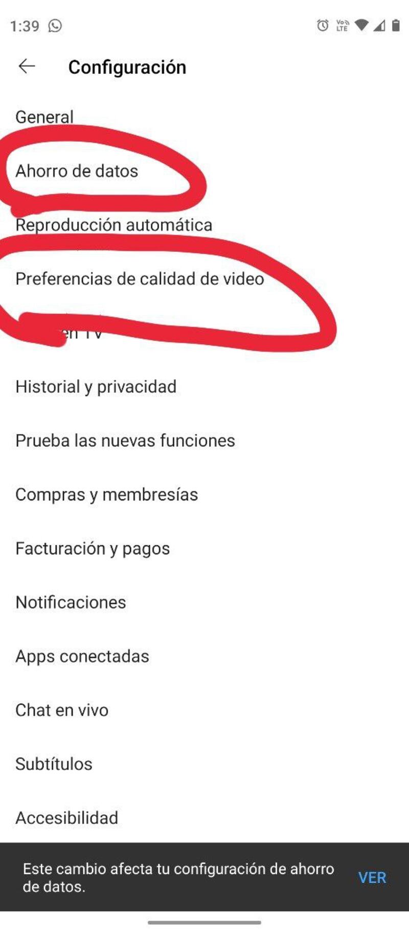 En este apartado encontraremos dos opciones vitales para solucionar el problema con la calidad de reproducción de nuestros videos: “Ahorro de datos” y “Preferencias de calidad de video”.