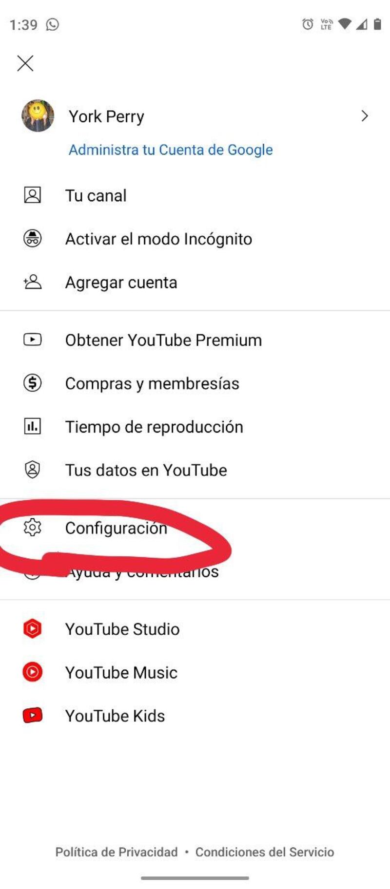 Lo primero que debemos hacer es abrir la aplicación de YouTube, dar tap en la esquina superior derecha donde está nuestra foto de perfil y luego ingresar a la opción de “Configuración”.