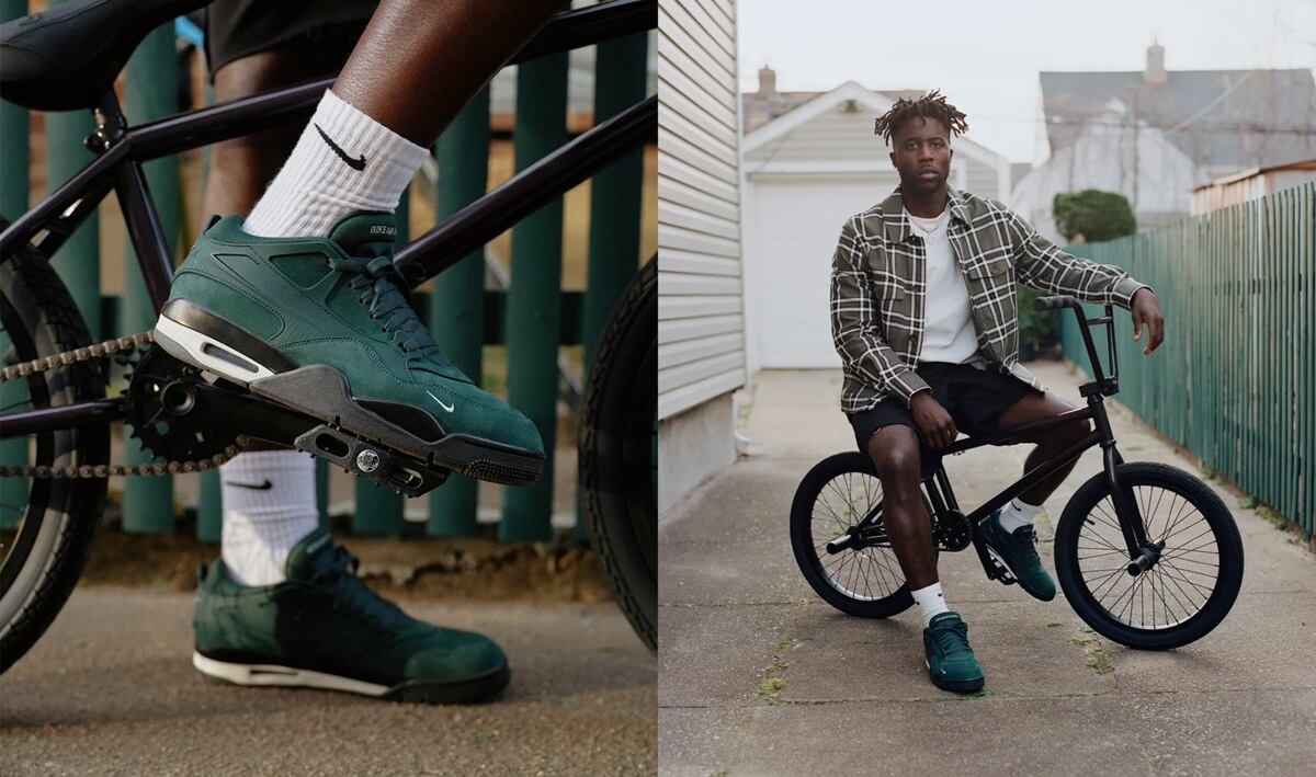 Trata-se dos Nigel Sylvester x Air Jordan 4 RM SP ‘Grandma’s Driveway - Fence Green’, uma colaboração entre o famoso ciclista de BMX Freestyle e a Nike. Estes tênis são a quarta versão entre o atleta e a marca de Michael Jordan.