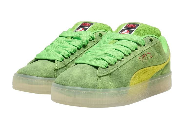 Esta coleção contará com dois designs de tênis XL da Puma, feitos para os amantes de calçados largos. O primeiro deles, inspirado no pegajoso fantasma Slimer, terá uma cor verde slime chamativa que nos transportará diretamente para as entranhas do Edifício Sedgewick. Como um detalhe divertido, sob a sola transparente é possível ver o desenho de um cachorro-quente, uma clara referência ao apetite insaciável do personagem.