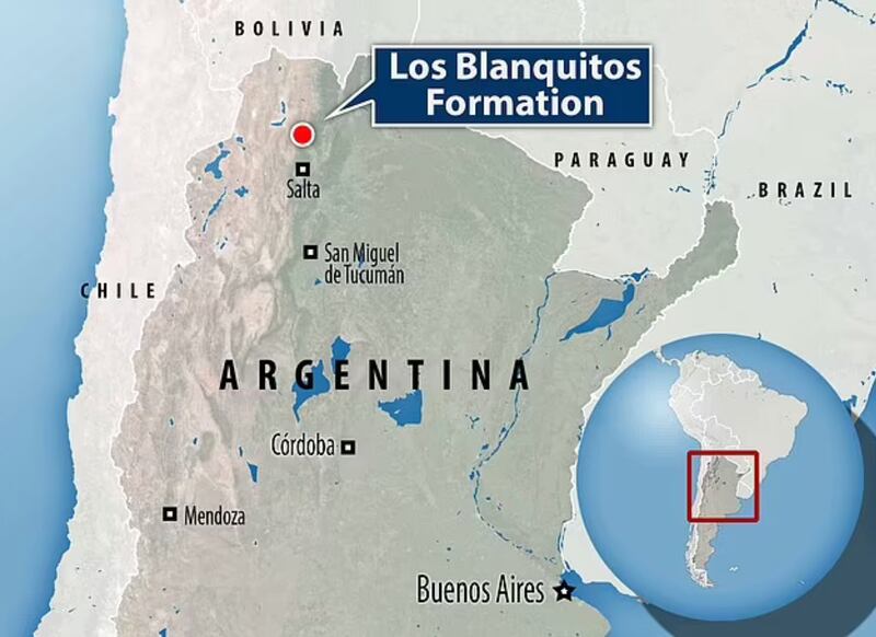 El cráneo, incluidas las partes superior y posterior del cráneo, se encontró en la Formación Los Blanquitos cerca de Amblayo, en el norte de Argentina, en rocas que datan de entre 75 y 65 millones de años. Esto significa que este animal vivió justo antes de la extinción masiva del final del Cretácico que vio la extinción de la mayoría de los dinosaurios.