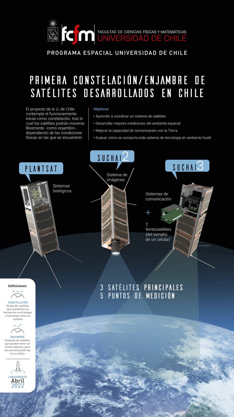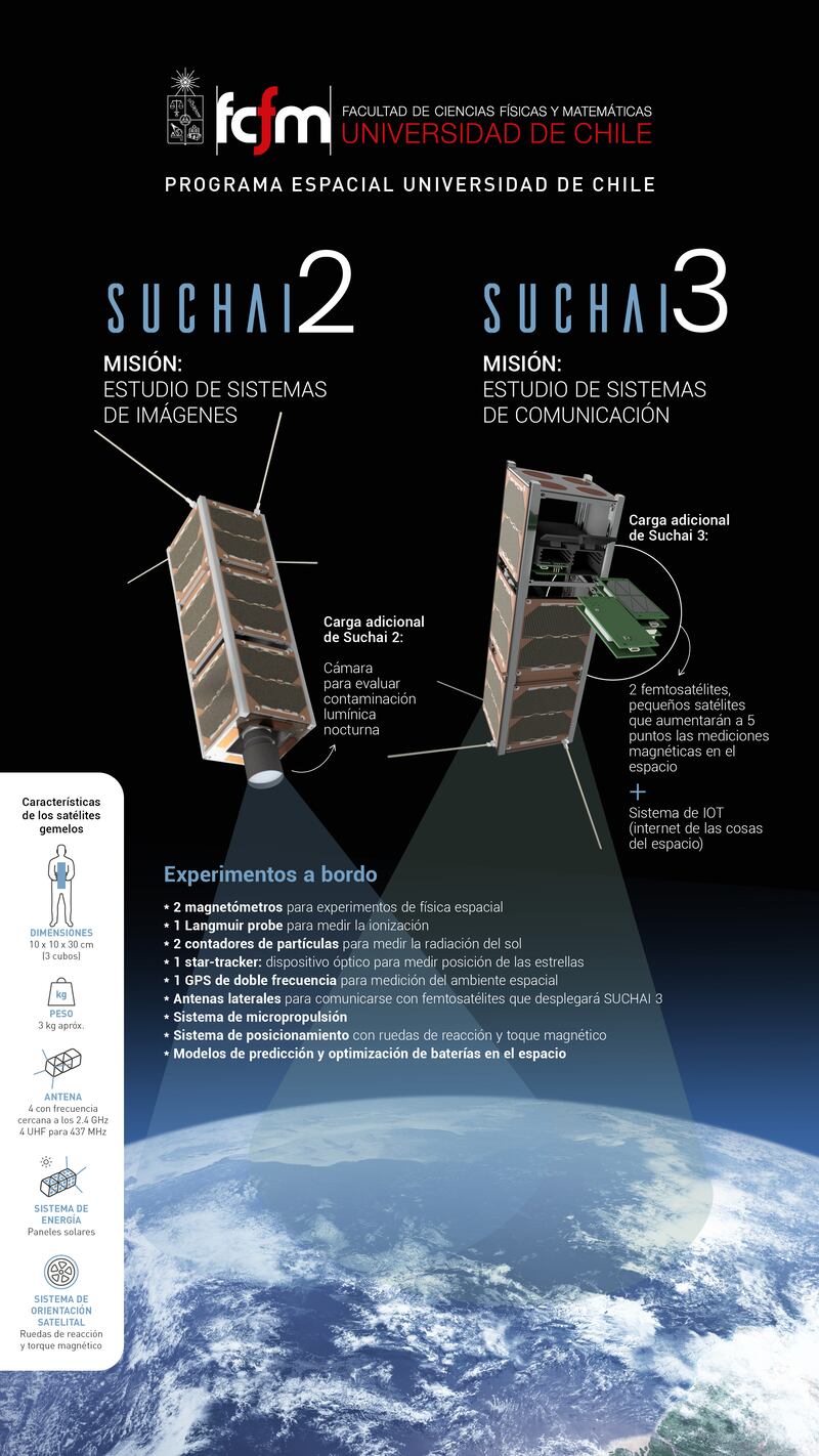 Entre los experimentos a bordo de los SUCHAI 2 y 3 se encuentran magnetómetros -instrumentos para medir la intensidad del campo magnético-, una sonda Langmuir, para estudiar la ionósfera, contadores de partículas de radiación solar, una cámara para evaluar la contaminación lumínica nocturna en el norte de Chile y un sistema de comunicación de largo alcance para internet de las cosas.