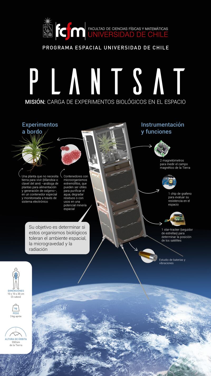 El PlantSat, en tanto, contiene una planta del tipo Tillandsia (o clavel del aire), análoga a las utilizadas para alimentación y generación de oxígeno, pero que no requiere sustrato para sobrevivir, además de contenedores con organismos extremófilos, que pueden ser útiles en posibles aplicaciones espaciales (purificación del agua, degradación de residuos) o tener uso en una potencial minería espacial. Además de estudiar la vida y crecimiento de microorganismos en el espacio, su objetivo es determinar si estos organismos biológicos toleran el ambiente espacial, la microgravedad y la radiación.