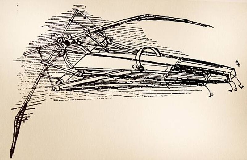 Leonardo también hizo bocetos de un avión o planeador, utilizable para una sola persona. En esta máquina voladora, el usuario iría acostado, como lo podemos ver en el dibujo.