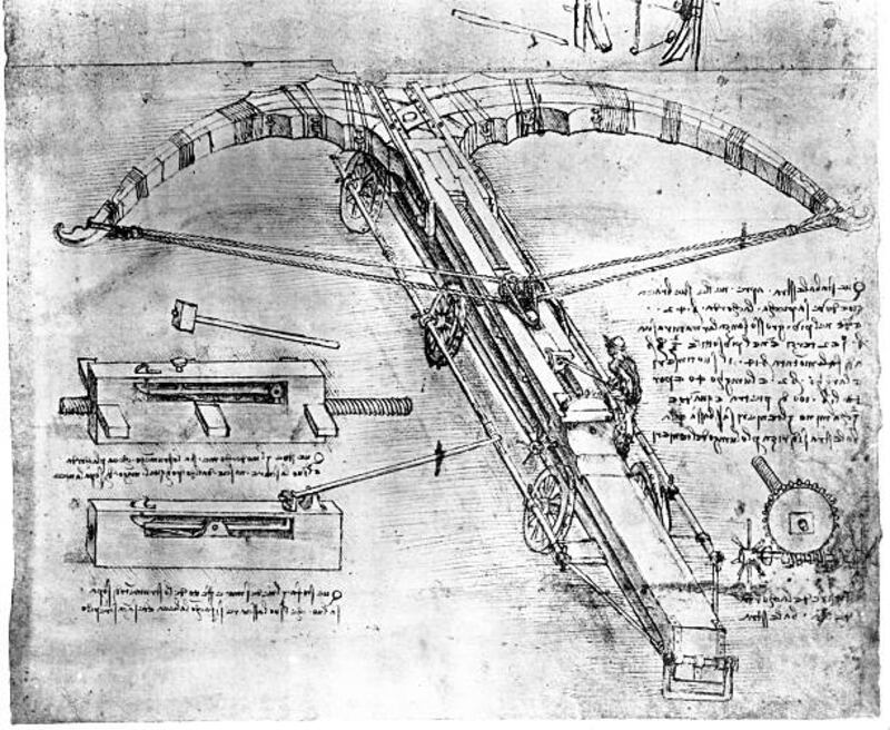 Una creación bélica más de Da Vinci es el de la ballesta gigante, que no contaba precisamente con una flecha, sino con una roca o bomba.