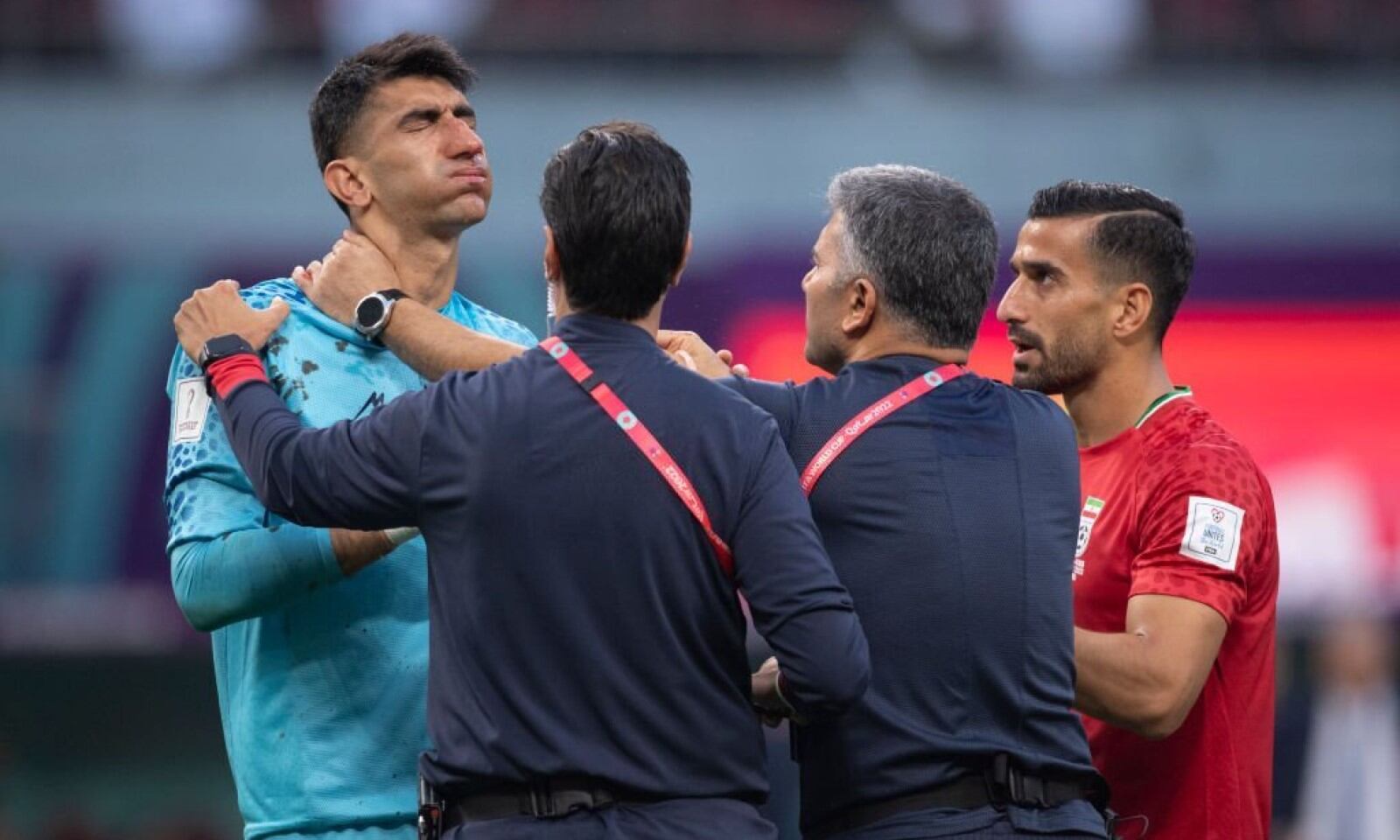 El arquero Alireza Beiranvand chocó con su compañero, Majid Hosseini, en una jugada por el partido entre Irán e Inglaterra, por el Mundial de Qatar 2022. Las dos cabezas se estrellaron, pero Alireza se llevó la peor parte.