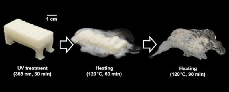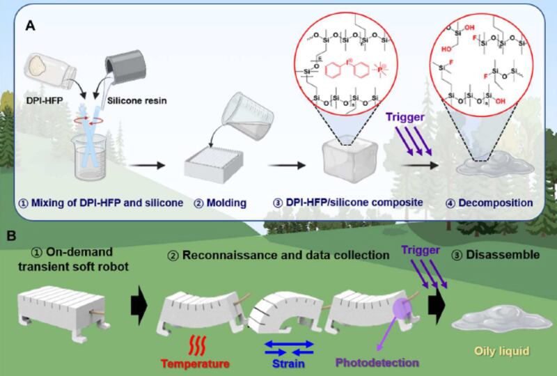 La autodestrucción se desencadena mediante la exposición a la luz ultravioleta, que convierte el hexafluorofosfato de difenilyodonio en fluoruro, debilitando la estructura del robot hasta que las altas temperaturas lo hacen derretirse por completo.