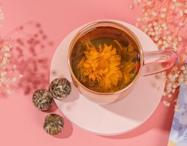 Los tés florecientes o flores de té, como también se los conoce, consisten en flores frescas envueltas en hojas de té blanco, en forma de bola. Cuando está sumergida en agua, se despliega delicadamente para proporcionar una impresionante exhibición floral.