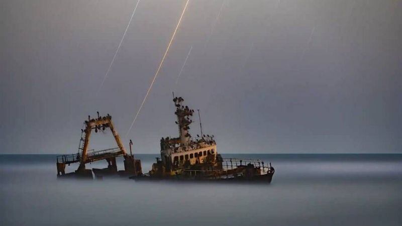 Un barco parece surcar la niebla, iluminado por estelas de estrellas que brillan a través del cielo nublado. La imagen es una de las fotos premiadas en el concurso Fotógrafo Astronómico del Año de 2023. Según una periodista de la revista Nature, la fotografía transmite sentimientos inquietantes que reflejan los desafíos actuales.