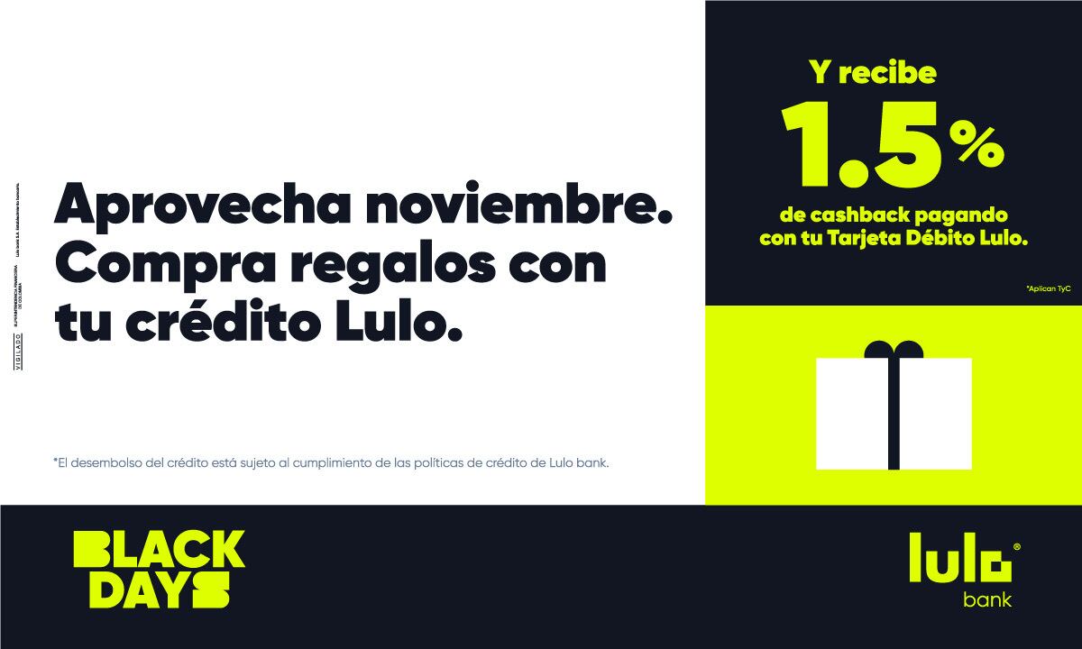 Hasta el 30 de noviembre las personas tendrán la oportunidad de solicitar un Crédito de Libre Inversión por hasta 50 millones de pesos, sin papeleos ni codeudores y con desembolso inmediato en su Lulo cuenta. Así podrán hacer sus compras con la Tarjeta Débito Lulo y recibir el 1,5% de cashback en cada transacción, ya sea en comercios físicos o digitales. Esto significa que no solo se podrán disfrutar de los descuentos de temporada, sino que también se recibirá un beneficio adicional.