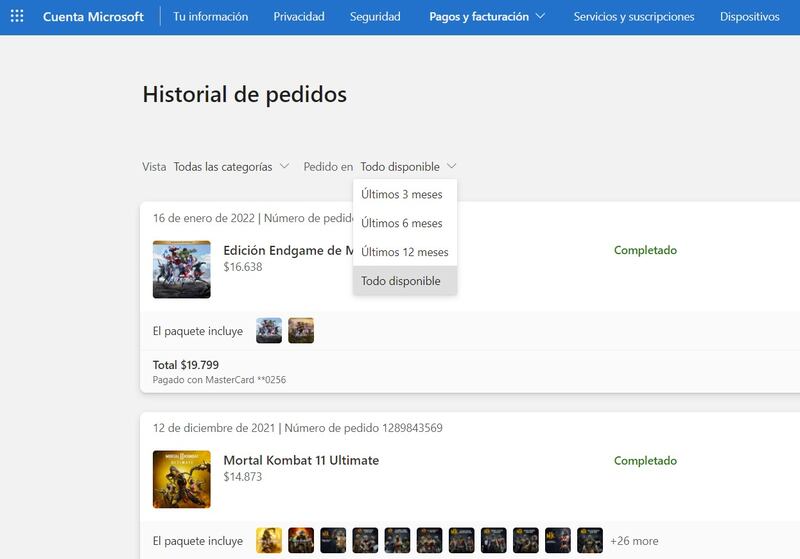 Todos los títulos y suscripciones de Xbox o videojuegos de Windows aparecen en la cuenta Microsoft asociada a las consolas. Para ver el detalle de los gastos, es necesario ir a la sección “Historial de pedidos” y hacer click en “Ver historial de solicitudes”.