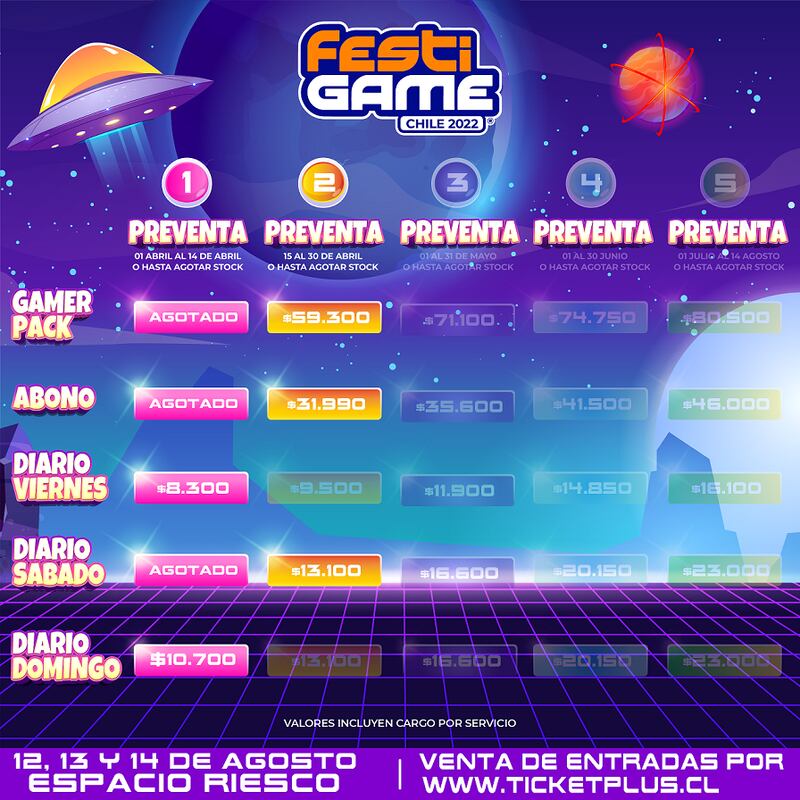 Como se anticipaba, la confirmación de la nueva edición presencial de FestiGame Fanta 2022, puso a todos los fanáticos de los videojuegos eufóricos. Por ello, la venta de entradas fue explosiva y en menos de 48 horas se agotaron los tickets disponibles en PREVENTA 1 para: Gamer Pack (pasa a valor Preventa 2); Abono para los 3 días (pasa a valor Preventa 2) y el Pase Diario Sábado (Pasa a valor Preventa 2). A continuación, el detalle de las alternativas agotadas y las que comienzan entonces la etapa PREVENTA 2:
