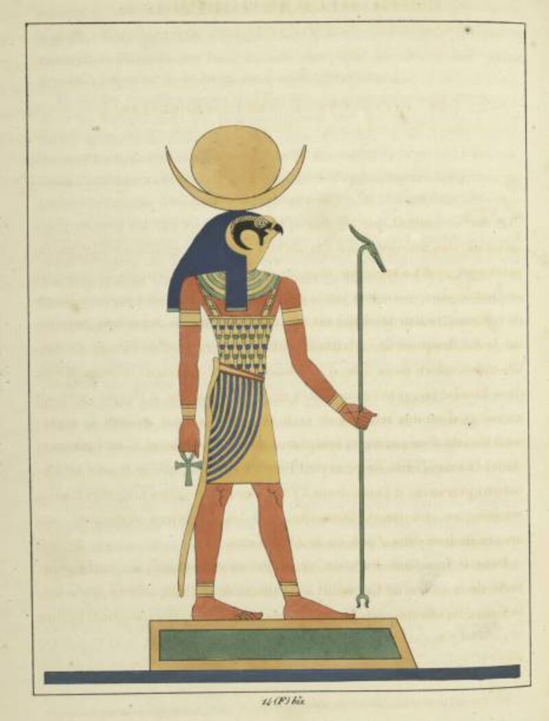 Como hombre, la deidad era representada como un hombre con barba en actitud de marcha, mientras que en su aspecto celestial tenía cabeza de halcón, identificándose con el dios Horus.