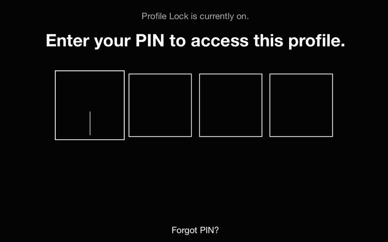 - Ingresa cuatro números para crear tu PIN de Bloqueo de perfil. Salvo que estés utilizando un dispositivo no admitido, tendrás que ingresar este PIN para abrir el perfil o reproducir los títulos que se hayan descargado desde allí.