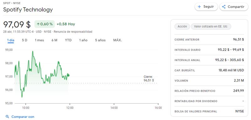 Debido a esto, las acciones de Spotify bajaron un 13.8% hasta la tarde del miércoles, a un mínimo de 96.60 dólares. Lo más bajo que alcanzaron: 95.56, para la noche. En la mañana de este jueves están en 97.09 dólares, experimentando una leve recuperación.