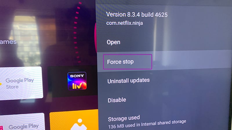 Para ello, desde la pantalla de inicio de Android TV, ve a aplicaciones, busca Netflix y mantén tu selección sin abrir la app para que se abra un menú deslizante. En él, elige Info y luego selecciona forzar detención.