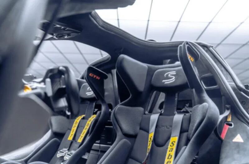 Las puertas son diédricas de doble bisagra, con asientos de carrera de fibra de carbono con respaldo fijo Sabelt, marca GTR, tapizados en Alcántara negro con arneses de seis puntos.