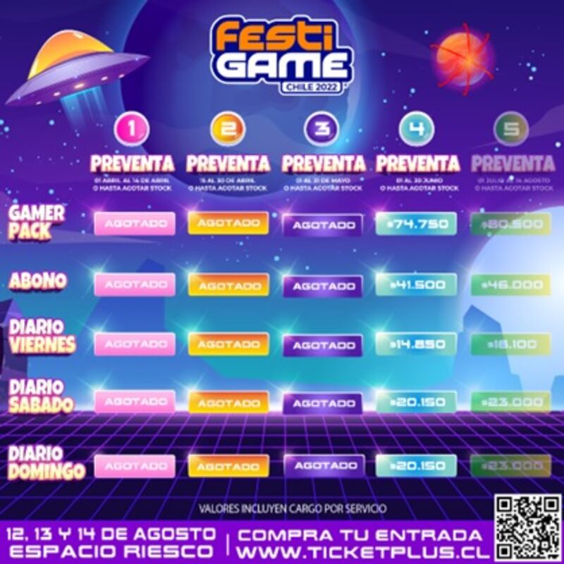 Las entradas se dividen entre: Tickets diarios, Abonos y Gamer Pack cuyo precio variará de acuerdo con la etapa de preventa. Normas Sanitarias FestiGame Fanta 2022 FestiGame Fanta 2022 tendrá una especial preocupación por mantener las normas sanitarias requeridas por la situación actual y que involucran un evento de esta envergadura.