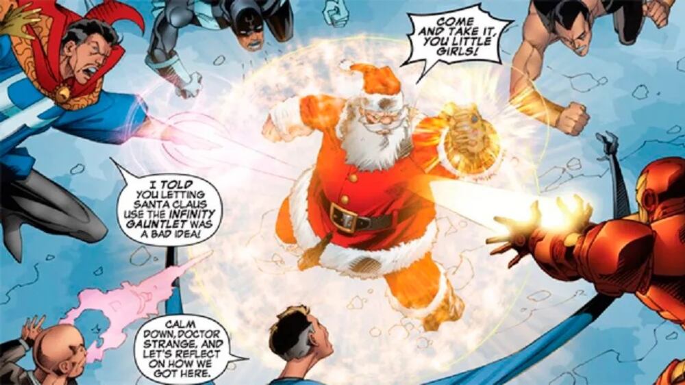 Además, hay imágenes en las que Santa Claus llega alguna vez a portar en su mano el Guantelete con las Gemas del Infinito mientras se enfrenta a una versión de los Avengers.