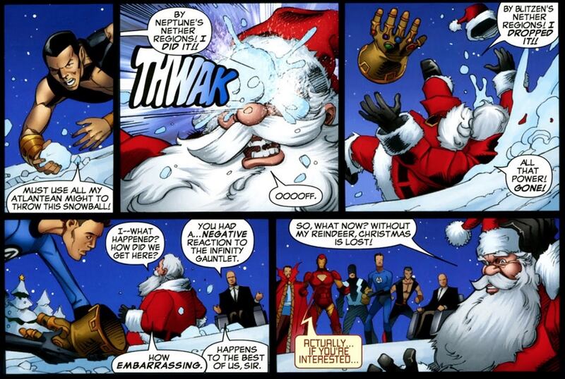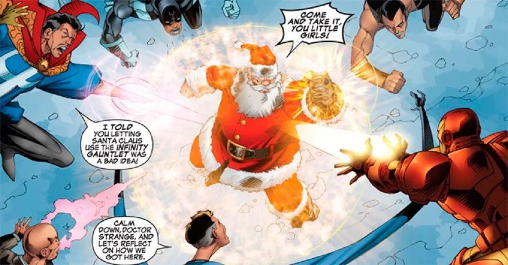 Además, hay imágenes en las que Santa Claus llega alguna vez a portar en su mano el Guantelete con las Gemas del Infinito mientras se enfrenta a una versión de los Avengers.
