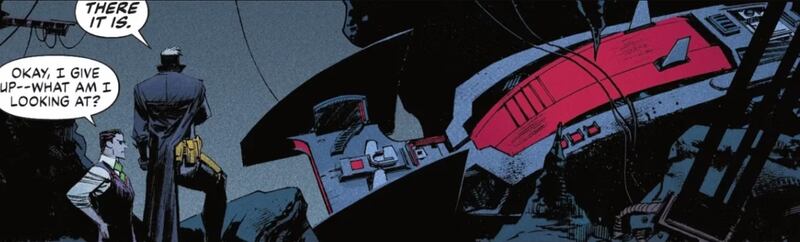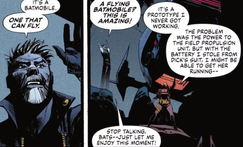 En Batman: Beyond the White Knight # 4, que ya está disponible en las tiendas estadounidenses, Bruce le explica a Jack que el vehículo es un viejo prototipo de hace mucho tiempo que nunca llegó a funcionar. Esto se debía a la necesidad de aplicar una alta cuota de energía para su propulsión.