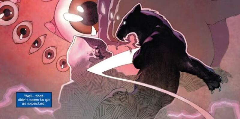 En el punto máximo del combate, T’Challa se convirtió en una pantera gigante, como Bast cuando se comunica con sus fieles en Wakanda. Allí asestó un golpe brutal a Doom, aunque finalmente terminaría perdiendo la batalla.
