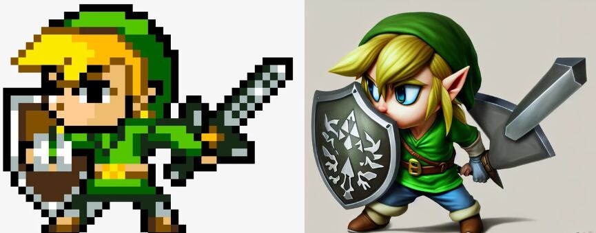 En donde las plataformas de IA ya no son alimentadas con dibujos a una tinta de manga, sino que se toma como base ilustraciones de cómics a todo color, gráficos poligonales de consolas de SEGA o en este caso pixel art de 8 o 16 bits.
