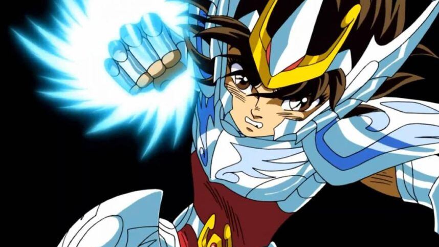 Lo que vemos en la ilustración es el simple Seiya de siempre con su cloth de bronce. La primera diferencia está en la expresión (y dibujo) de su rostro. La forma de los ojos y el trazo facial es directamente diferente a lo que hizo Masami Kurumada.