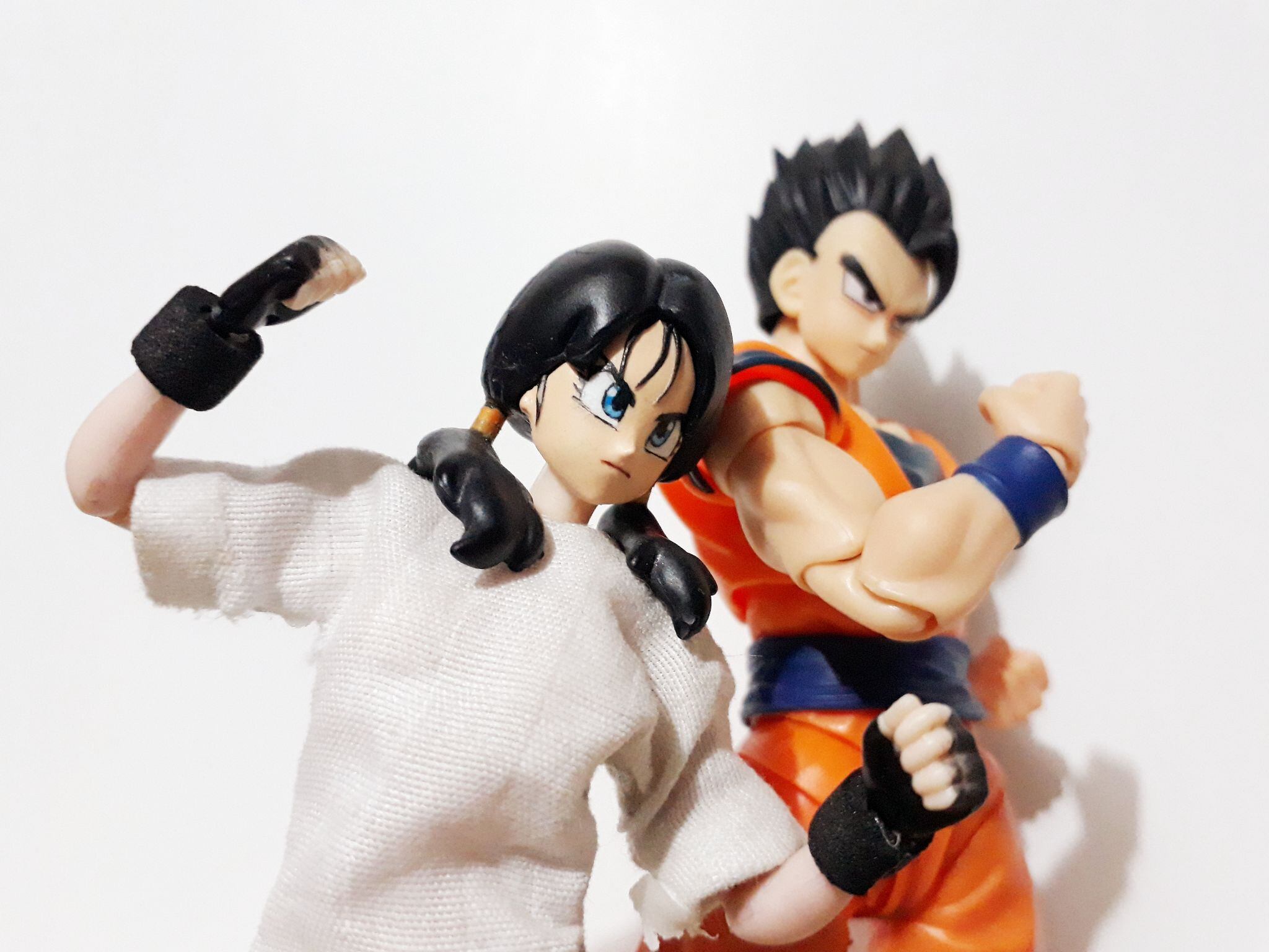 El rostro de Gohan y su pelo corresponden justamente al pasaje de su vida escolar y como superhéroe. Mientras que Videl posee un diseño que igual nos evoca al momento en el que conoció a ese personaje por primera vez y cuando descubrió que era Gohan el enmascarado: