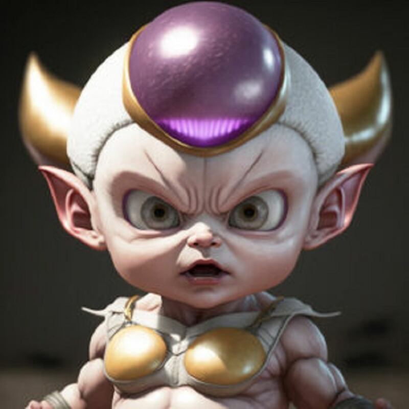 Incluso Freezer, el tirano del espacio, ha sido reducido a un bebé malhumorado con su característica piel morada. No podemos evitar preguntarnos si seguirá planeando conquistar el universo mientras chupa su chupete con una expresión de descontento.