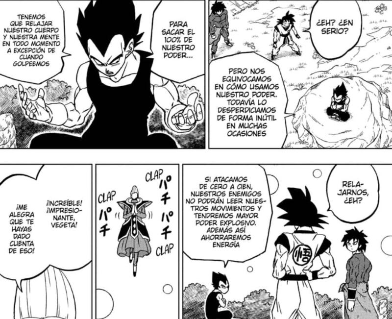 Whis escuchó y comenzó a aplaudir a Vegeta por haberse dado cuenta de este elemento en específico, con el que le comienza a sacar ventaja a Goku.