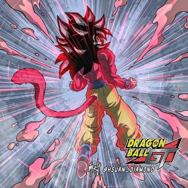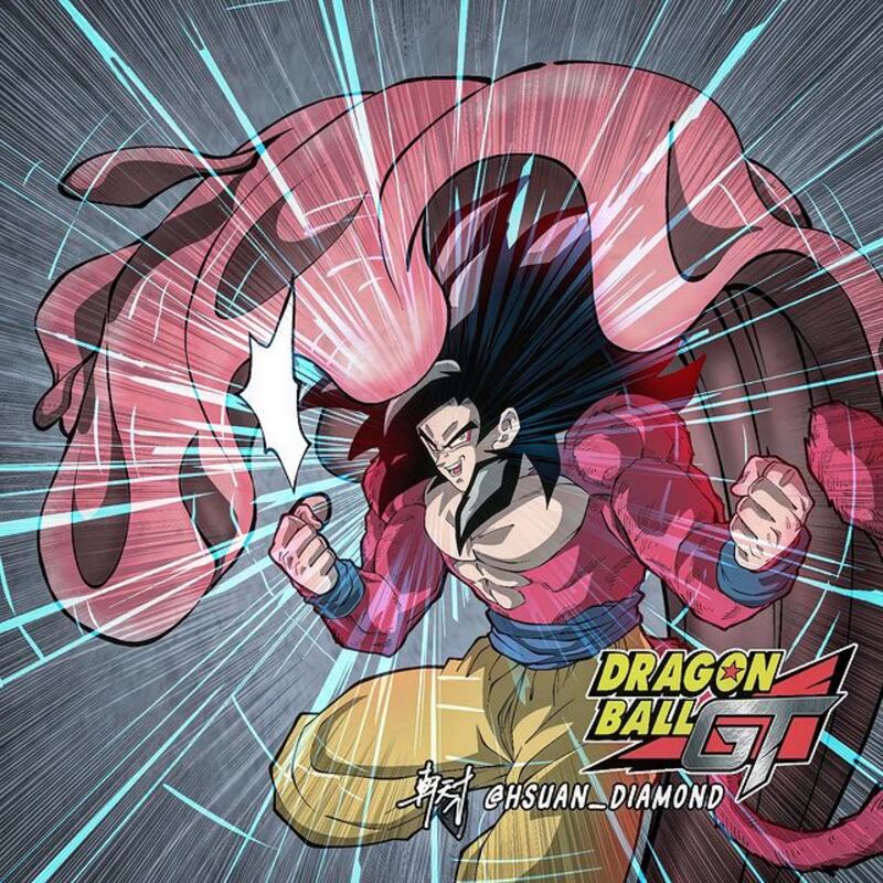 Se trata de Goku de Dragon Ball GT. El pequeño guerrero se transforma en Super Saiyajin 2, después en tres y llega al 4 para explotar con su ki partes de color rosa del cuerpo de Majin Buu.