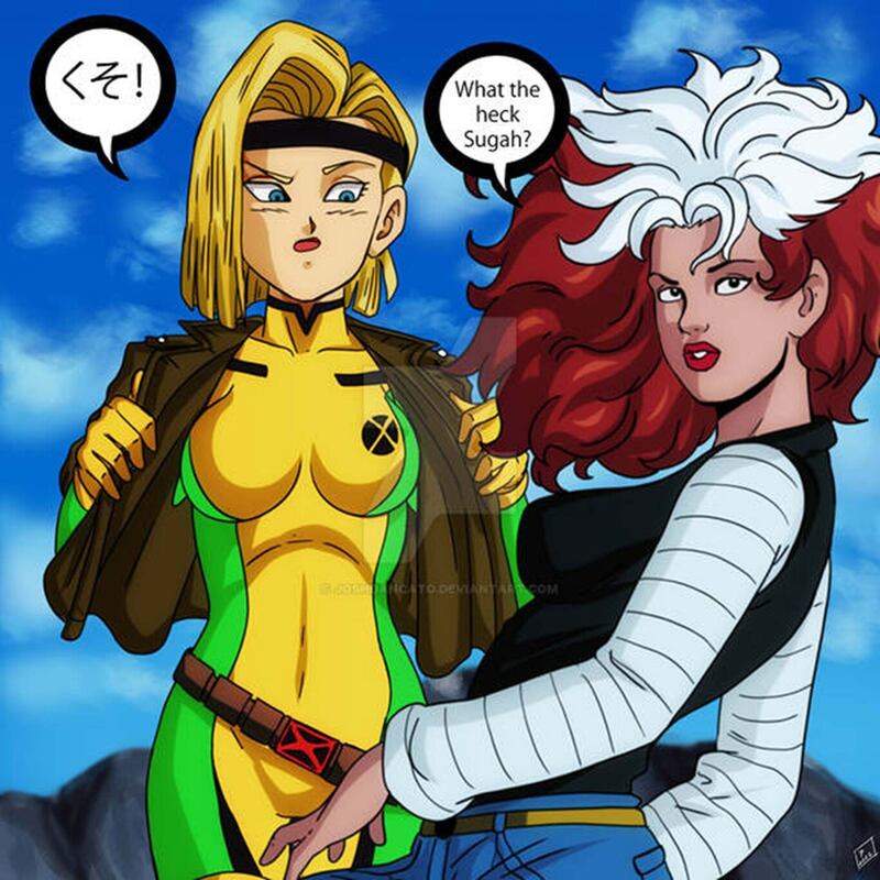 En esta fusión retorcida vemos como la mutante Rogue, conocida por su habilidad para absorber los poderes y recuerdos de otros a través del contacto físico, desarrolla una conexión inesperada con Androide 18 intercambiando roles prácticamente.