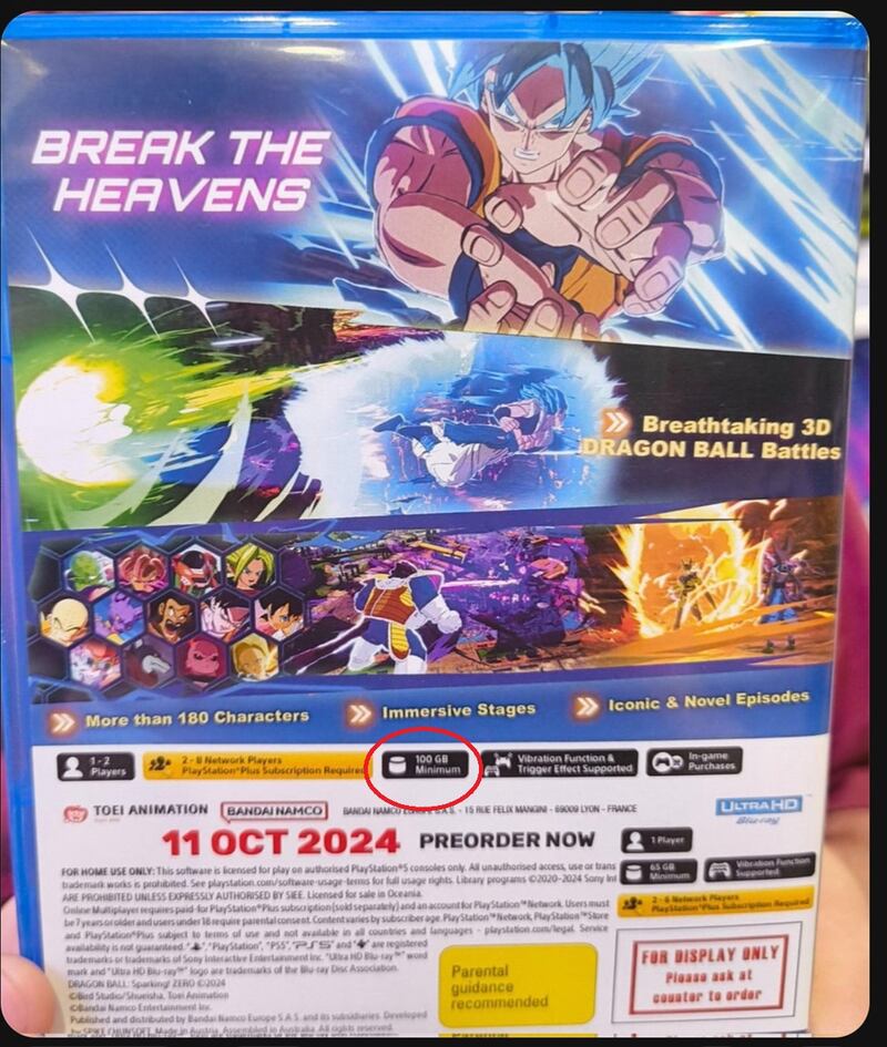Pero a lo que vinimos, el peso o tamaño del juego. La gente de Hobby Consolas se hace eco de una imagen que está rodando por Internet, de la caja promocional del Dragon Ball Sparking! ZERO físico, en el que supuestamente se indica que pesará cómo mínimo 100 GB.