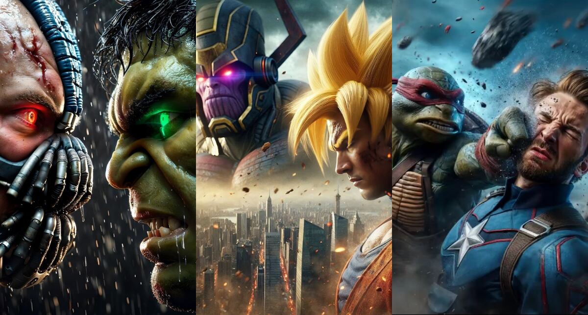 Batman contra el Capitán América en un octógono de la UFC, Bane contra Hulk, Venom teniendo a Thanos como huésped, Galactus contra Goku, Wolverine y Deadpool manejando carros de Mario Kart y las Tortugas Ninja contra un ícono de Marvel, son tan solo algunas de las sorprendentes batallas que imagina este usuario, al que pueden encontrar en Instagram como MidJourneyChampion.