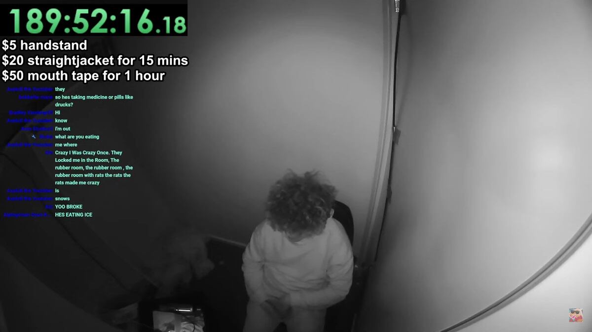 El creador de contenido, de origen australiano, realiza una transmisión en vivo mientras está encerrado en una habitación pequeña (aproximadamente de 2x2) completamente oscura, con una silla y un colchón.