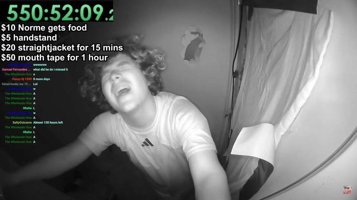 Dentro del reto que ya es estar un mes encerrado en esas condiciones, hay otros “sub-retos”, que hace por dinero. Si le donas una subscripción de 5 dólares hará una parada de manos. Si le donas 20 dólares usará una camisa de fuerza por 15 minutos y su le das 50 dólares se pondrá una cinta adhesiva en la boca por una hora.