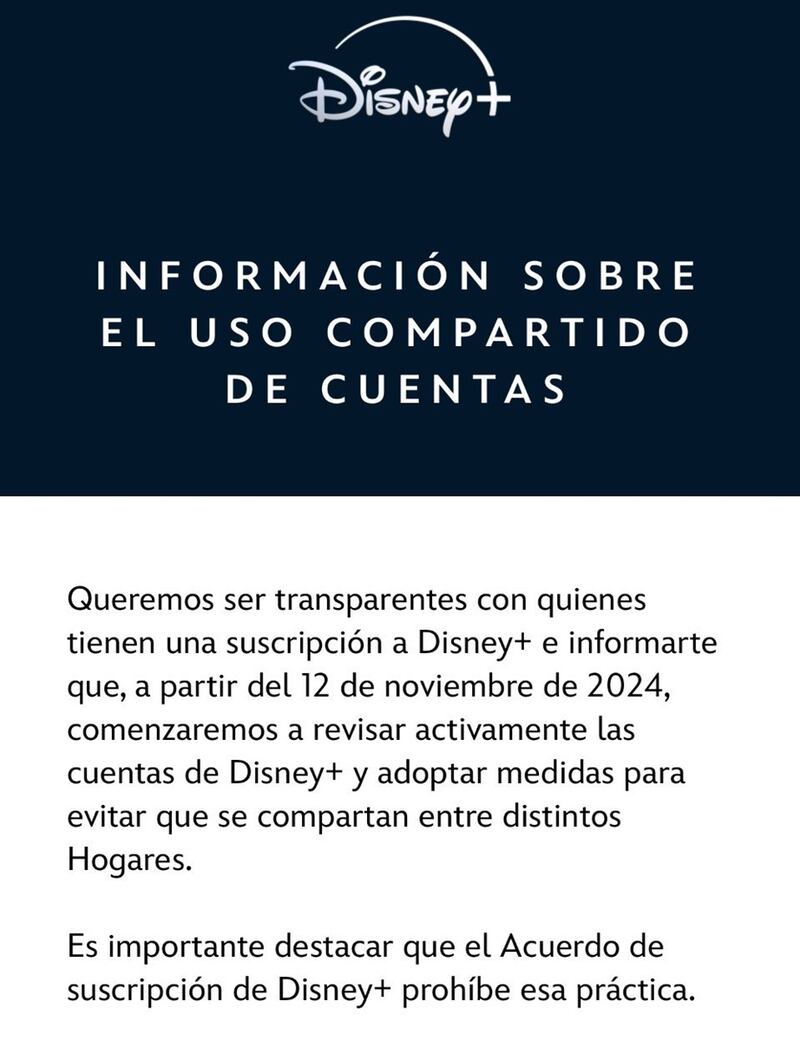 “Queremos ser transparentes con quienes tienen una suscripción a Disney+ e informarte que, a partir del 12 de noviembre del 2024, comenzaremos a revisar activamente las cuentas de Disney+ y adoptar medidas para evitar que se compartan entre distintos hogares. Es importante destacar que el ‘Acuerdo de suscripción de Disney+’ prohíbe esa práctica”, dijeron desde el departamento de comunicaciones de la empresa.