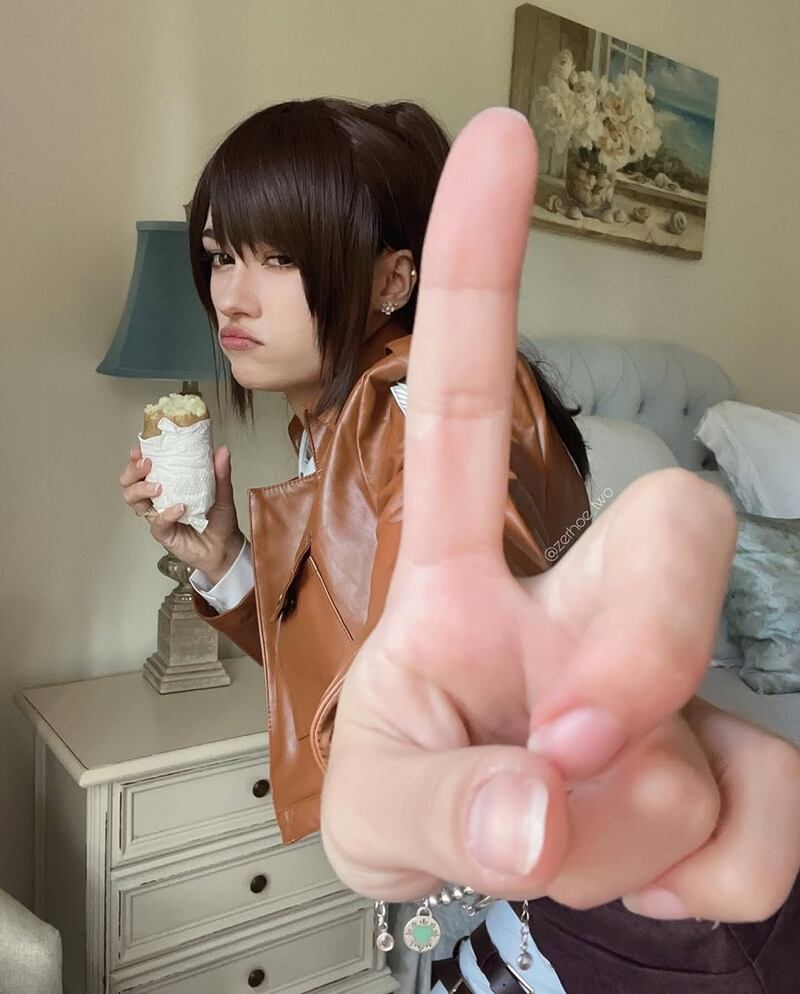 El abrigo de cuero marrón claro, con sus insignias respectivas, su espada característica y hasta la actitud y personalidad de Sasha, se combinan con el peinado idéntico al de la waifuy el rostro angelical de esta modelo.