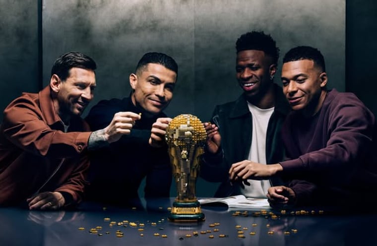 El anuncio muestra a Messi, Cristiano Ronaldo, Mbappé y Vinicius Jr. sentados alrededor de una mesa, construyendo una versión en LEGO del trofeo de la Copa del Mundo.