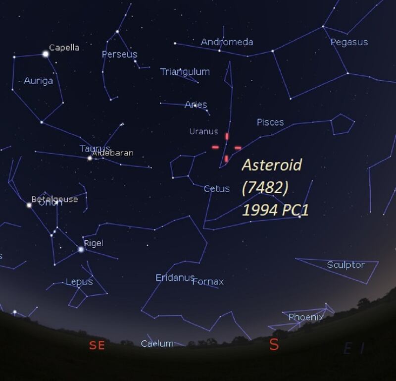7482 1994 PC1 viaja aproximadamente a 70 mil kilómetros por hora y tiene un diámetro de 1 kilómetro. Su visita está programada para el próximo martes 18 de enero a las 16:51 (tiempo del este). Según los científicos, para quienes cuenten con un telescopio básico, lo pueden sacar y apreciar su paso.