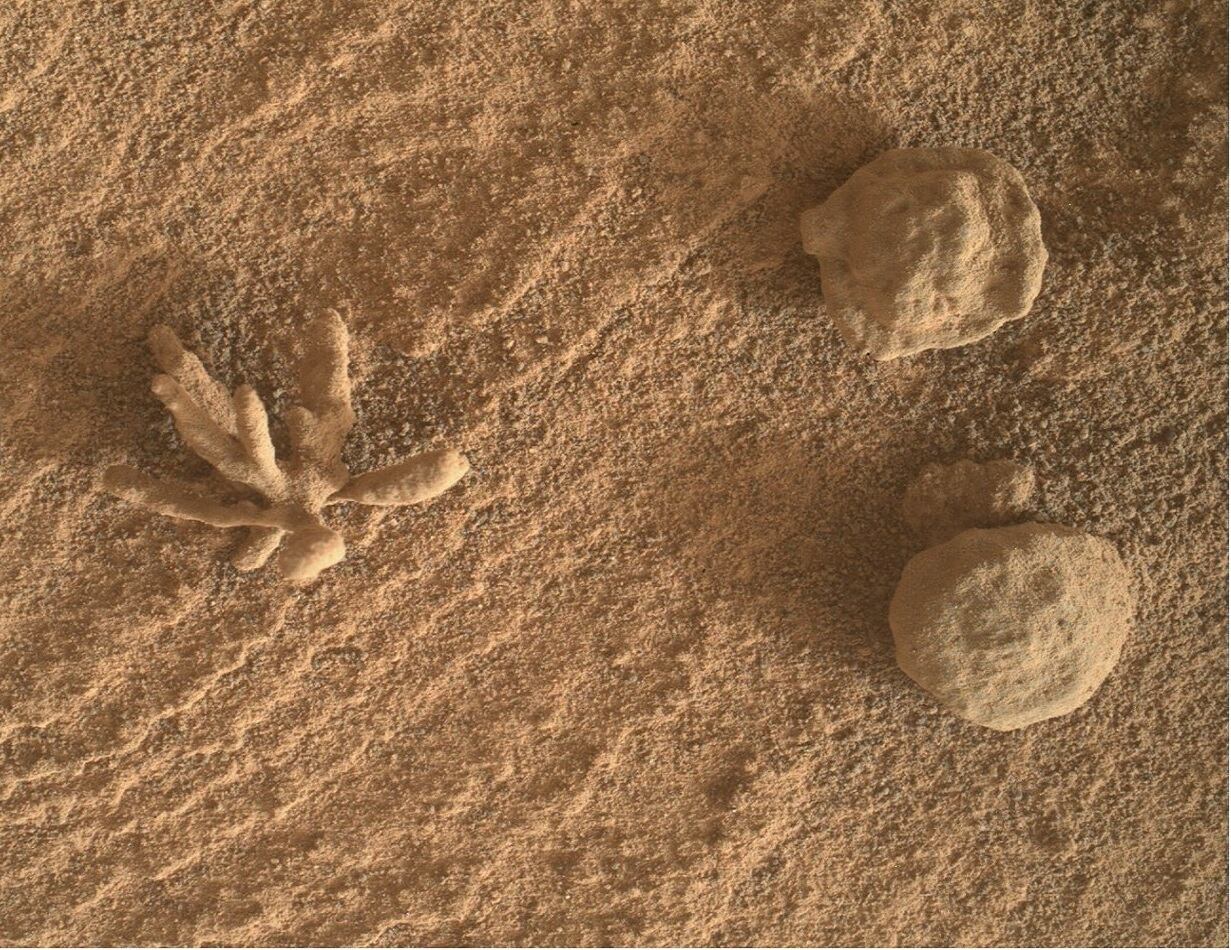 Según lo que se aprecia en las mismas imágenes que comparte la NASA, la formación que se posa en el suelo del planeta rojo, tiene aspecto de flor. Pero los científicos lo comparan con una especie de elemento orgánico.