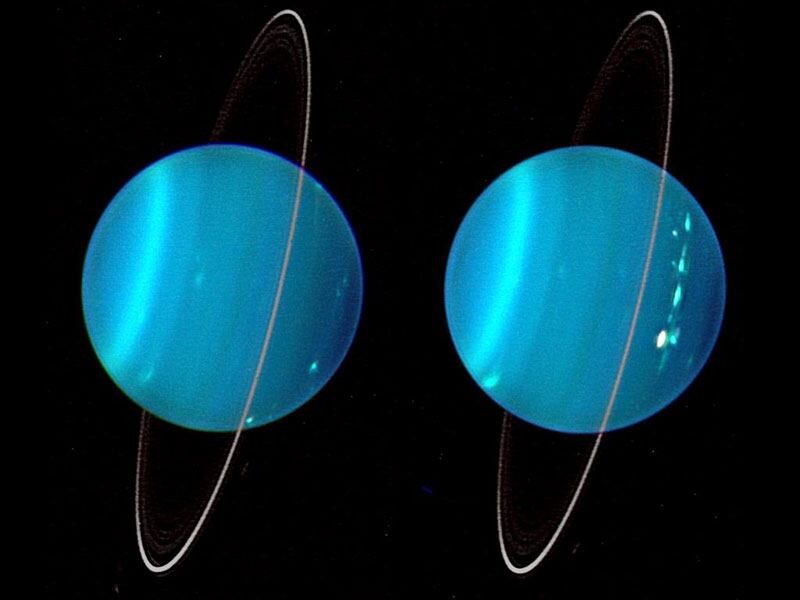El séptimo planeta desde el Sol es el único cuyo ecuador está casi en ángulo recto con su órbita, debido a una colisión. Tiene más metano en su atmósfera, principalmente de hidrógeno y helio, que Júpiter o Saturno, y el metano le da su particular color azul.