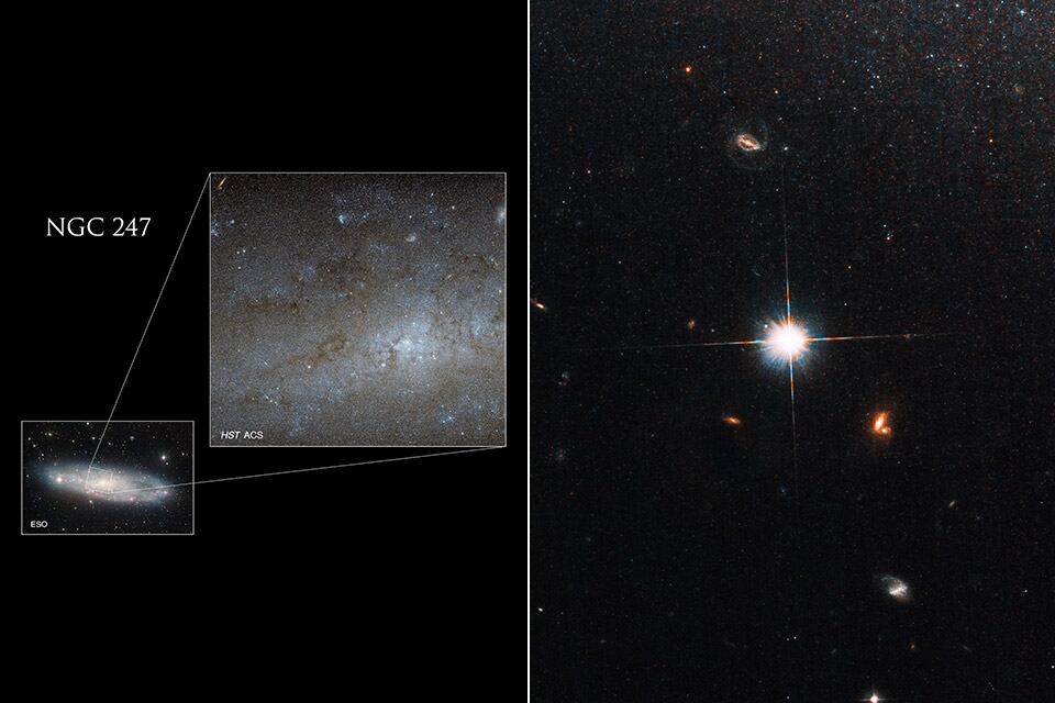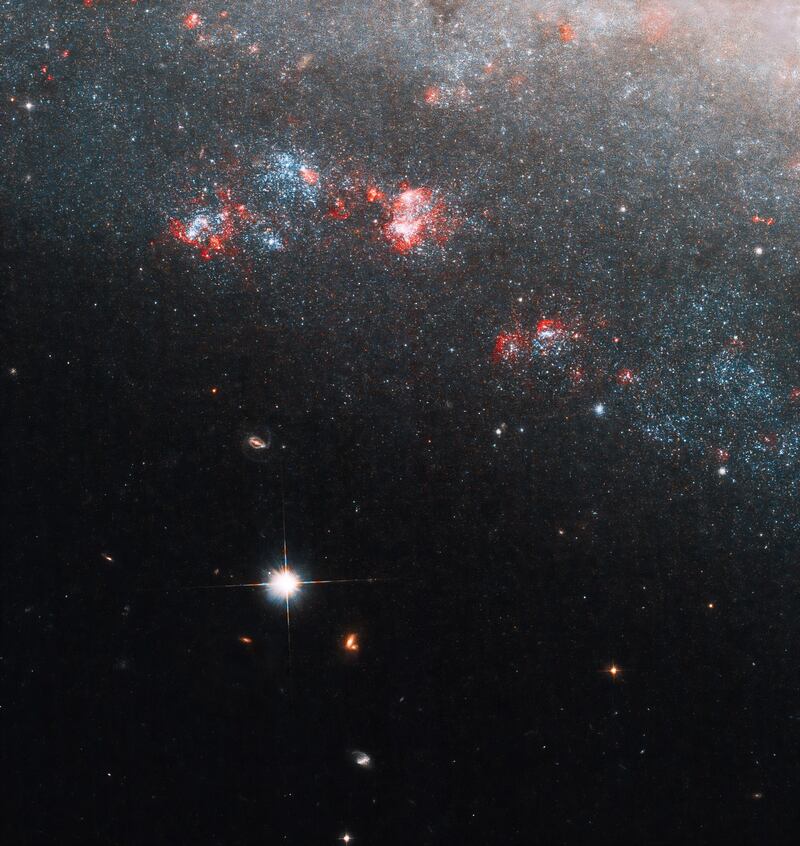 Esta nueva imagen lograda por el Hubble muestra una sección de la galaxia espiral enana llamada The Needle’s Eye (“El Ojo de la Aguja” en español), también conocida como NGC 247 o Caldwell 62 y que se encuentra aproximadamente a 11 millones de años luz de distancia en el Grupo Sculptor, el grupo de galaxias más cercano al de la Tierra, el Grupo Local.